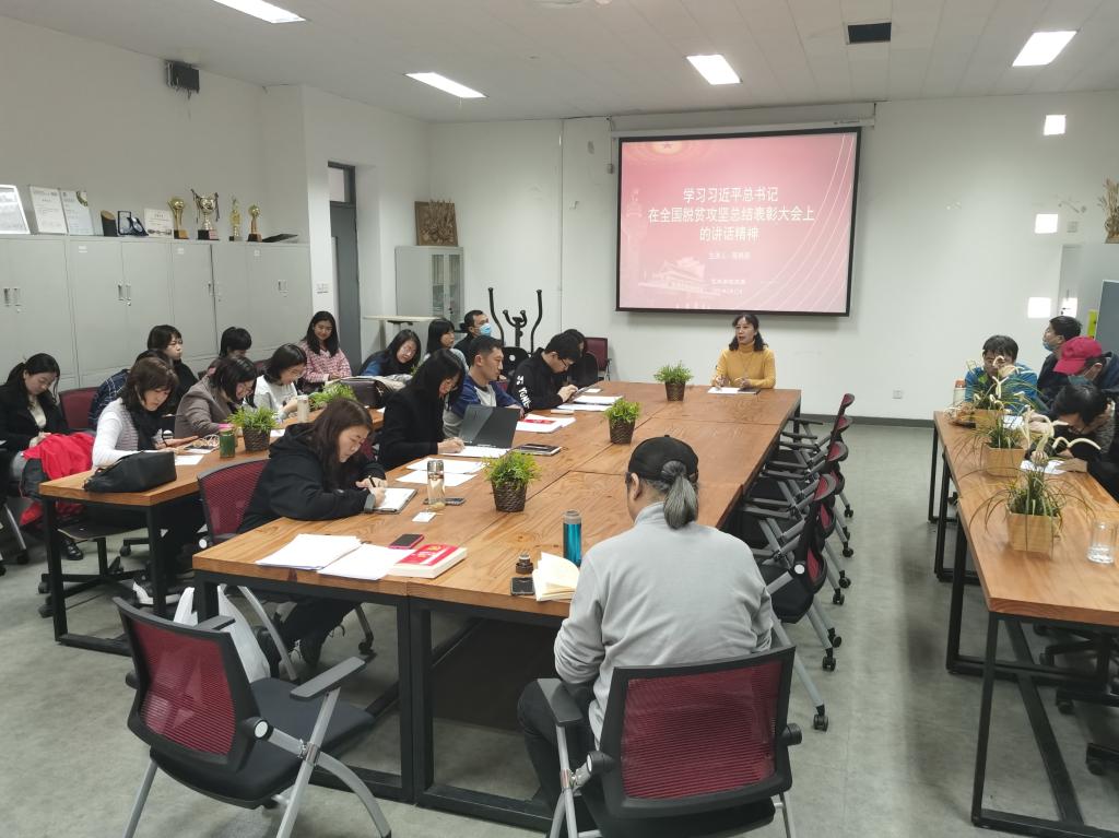 按照校党委宣传部的要求,bl动漫 党委高度重视,精心组织,于3月12日下午14:00在会议室,由院党委书记陈艳丽同志向全体教职工宣讲了关于习近平总书记在全国脱贫攻坚总结表彰大会上的重要讲话精神。2020年是决胜全面建成小康社会、决战脱贫攻坚之年,面对新冠肺炎疫情和严重洪涝灾害的考验,党中央坚定如期完成脱贫攻坚目标决心不动摇,全党全社会勠力同心真抓实干,贫困地区广大干部群众顽强奋斗攻坚克难,脱贫攻坚取得决定性成就。