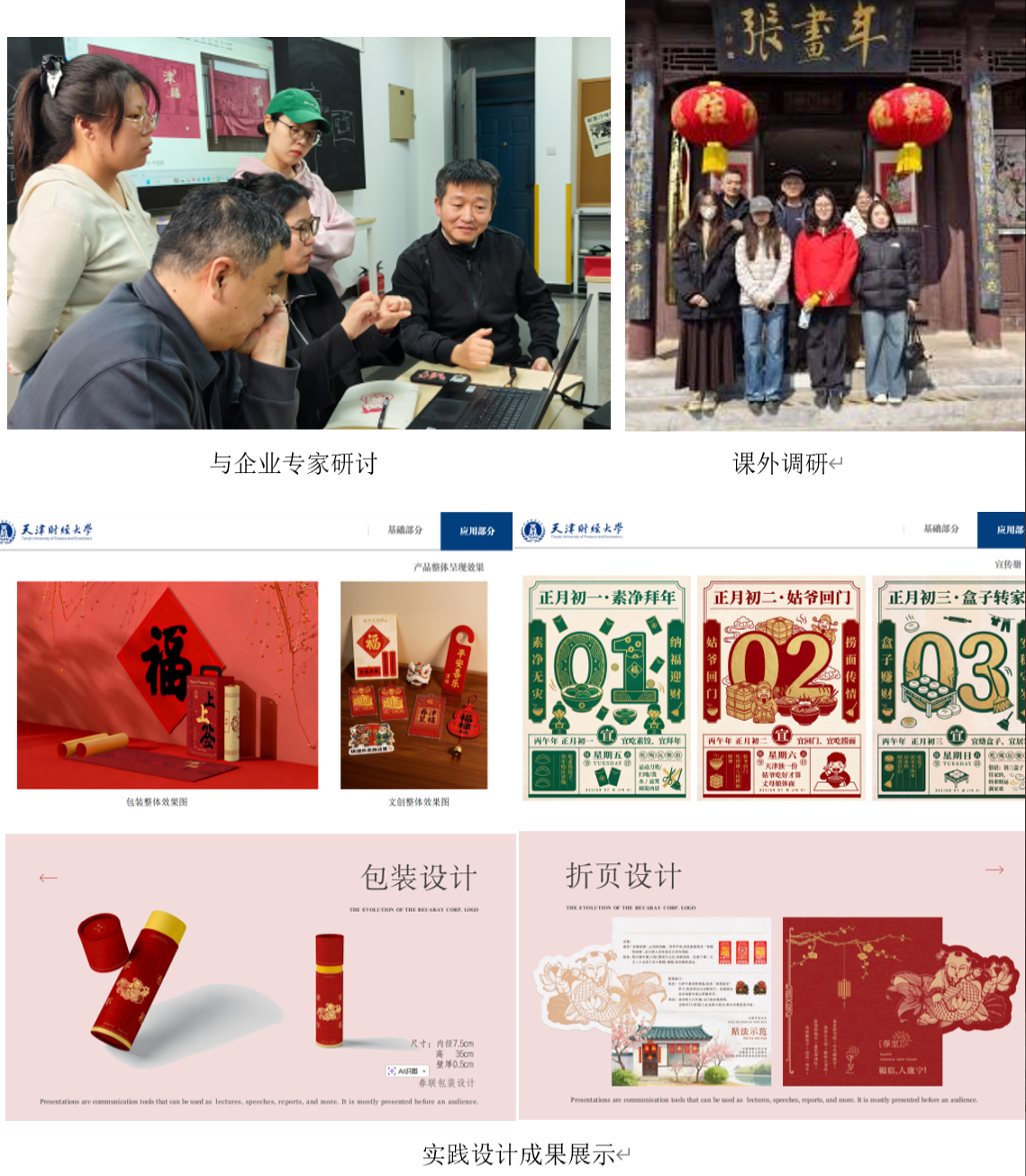 在校园课堂研讨环节,师生与企业导师围绕传统文化年节礼盒包装展开深度交流。“上上签”红色礼盒刀版图、春节对联福字文创设计稿逐一呈现,企业导师从市场定位、消费场景、工艺落地等角度,为学生们剖析包装设计的商业逻辑;师生们则结合“双钻石模型”“亲和图”等设计方法,探讨如何将传统民俗文化转化为符合当代审美的视觉语言,让传统文化在产品包装中焕发新生。课堂上,思想碰撞不断,既夯实了学生的设计理论基础,也让大家直观感受到商业设计的实战要求。