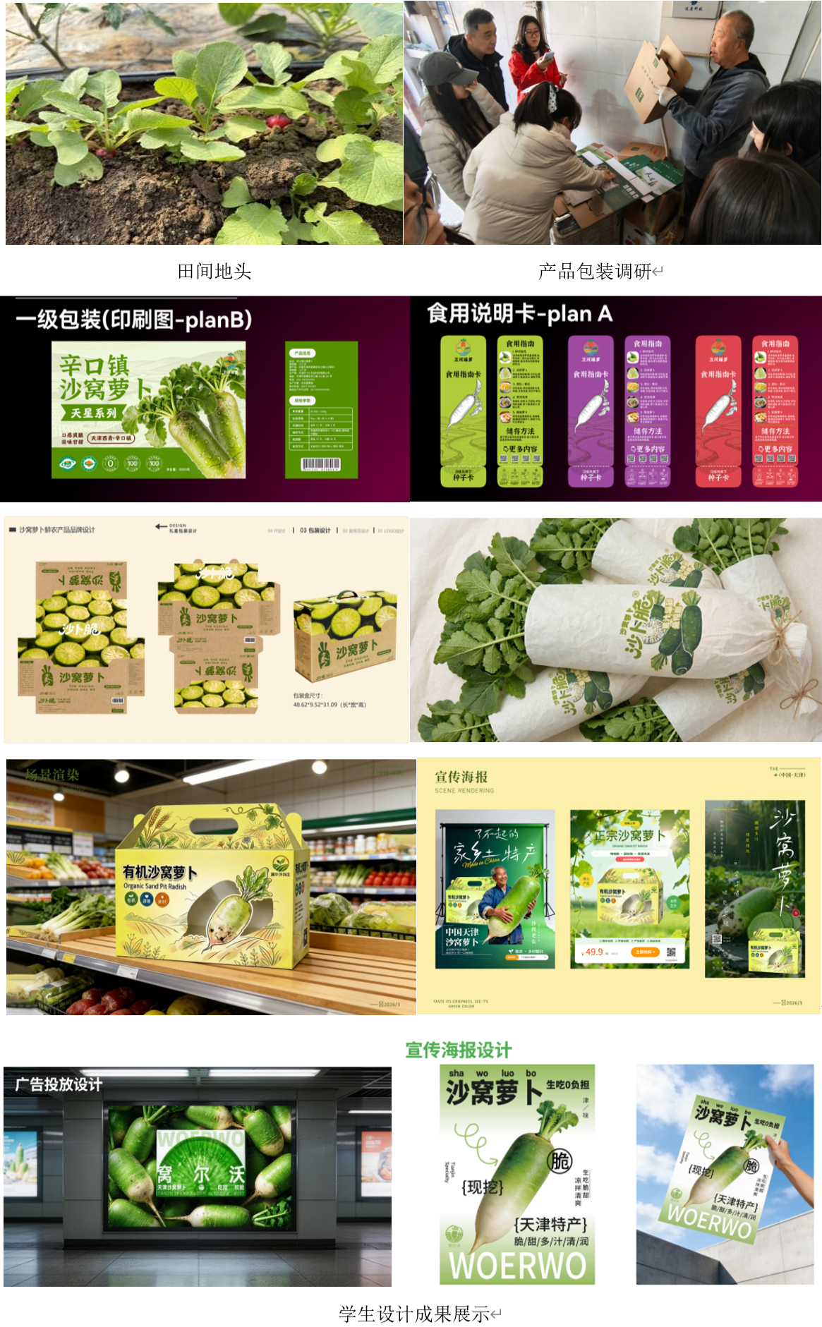 为了让设计真正服务于产业发展,导师和研究生们在《专业设计实践》课程中走进“沙窝萝卜”种植基地,与企业导师共同调研萝卜产品的包装与营销思路。在田间地头,大家实地了解萝卜的生长特性、产品形态与市场痛点;在生产作坊里,企业导师依托包装样品,细致讲解农产品包装的防潮、运输、陈列等实际需求。师生们围绕“如何通过包装设计提升农产品附加值”“怎样用年轻化视觉语言拓宽销售渠道”等问题展开热烈讨论,将课堂所学的包装结构、色彩搭配、品牌策划等知识,与乡村产业的真实需求精准对接,探索出“文化赋能+产业升级”的包装设计新方向。